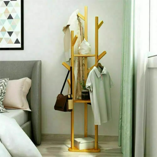 12 Hooks Wooden Stand Clothes Hat Bag Hanger w/Umbrella