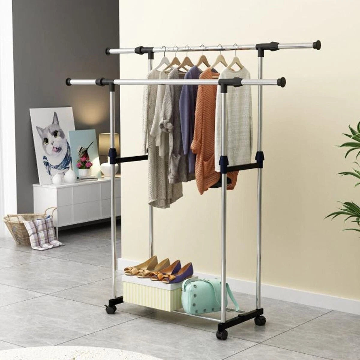 This versatile and adjustable double clothes rack is perfect for keeping your garments organised in any setting. Made from sturdy stainless steel, it features dual adjustable rails that provide ample hanging space for coats, dresses, and more. With easy height and width adjustments, it can accommodate various clothing lengths and sizes. The four smooth-rolling wheels allow for easy mobility, making it simple to move the rack around as needed. Designed for stability and durability, this rack is ideal for both home and retail environments, holding a significant weight of garments without wobbling.